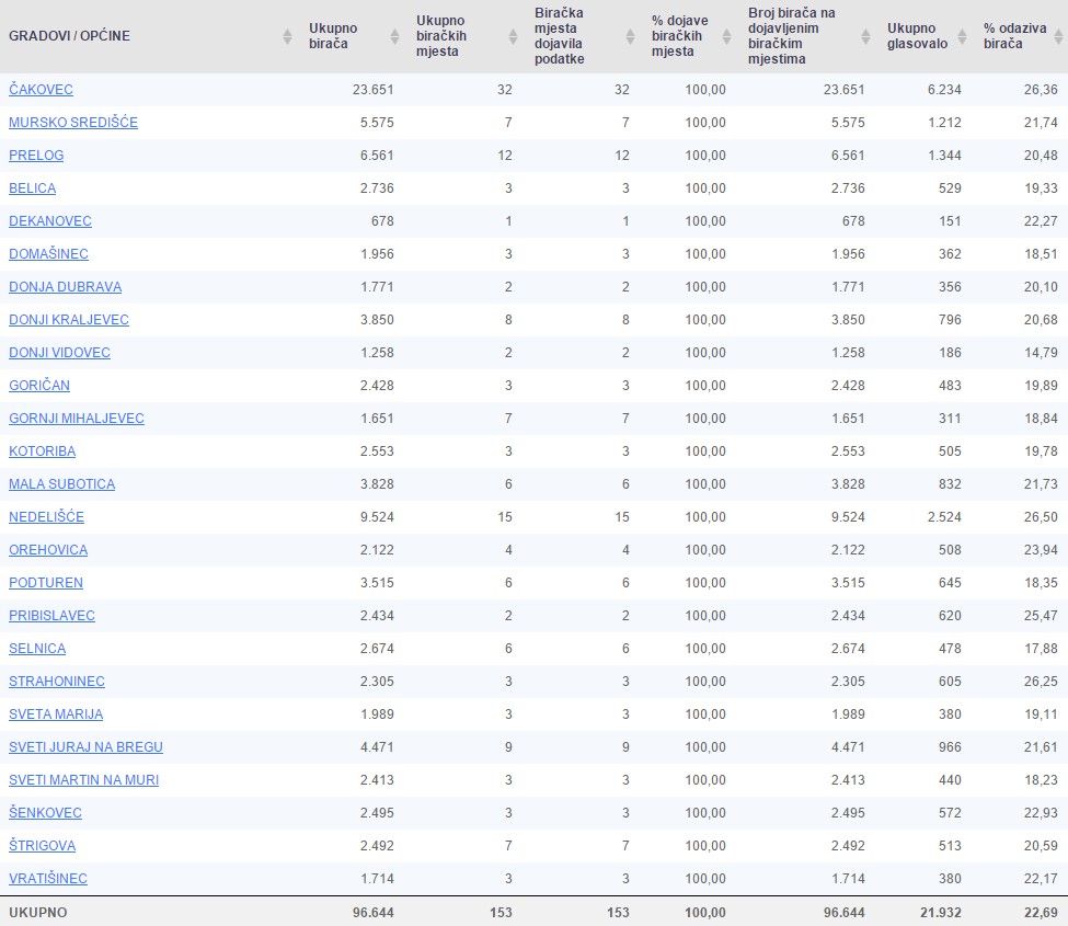 Najveći postotak izlaznosti je u Nedelišću (26,50%), a najmanji u Donjem Vidovcu (14,79%).