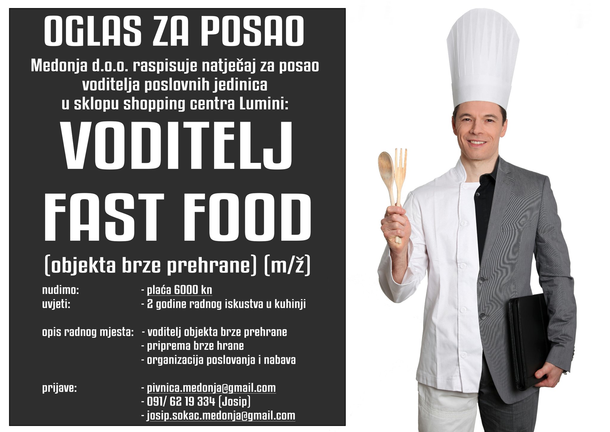 Tvrtka Medonja d.o.o. sinonim je za kvalitetu u području ugostiteljstva i gastronomije u našim krajevima, dosegli su broj od sedam lokacija, od toga dvije u shopping centru Lumini. Upravo tamo su u potrazi za voditeljima objekata brze prehrane.
