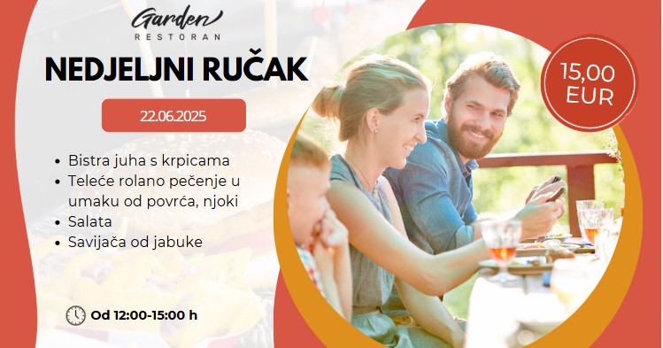 Svake nedjelje u restoranu Garden poslužuje se nedjeljni ručak kojem je cijena 15€ po osobi.
