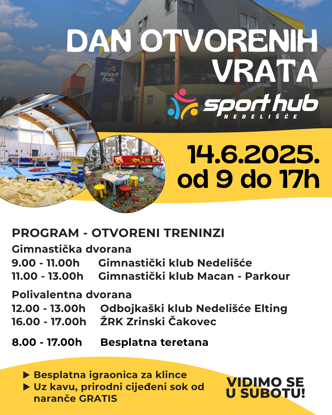 Gimnastički klub Nedelišće svoj otvoreni trening održati će od 9-11h, Odbojkaški klub Nedelišće Elting u terminu od 12-13h te Rukometni klub Zrinski Čakovec od 16-17h.