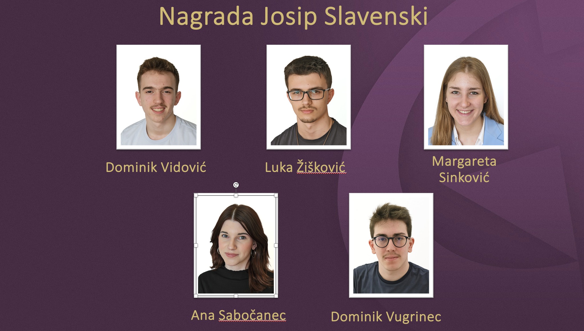 S ponosom predstavljamo dobitnike Nagrade Josip Slavenski, najvišeg priznanja koje Gimnazija Josipa Slavenskog Čakovec dodjeljuje darovitim, predanim i iznimno uspješnim maturantima, onima koji su tijekom srednjoškolskog obrazovanja ostavili dubok trag znanjem, radom i osobnošću: