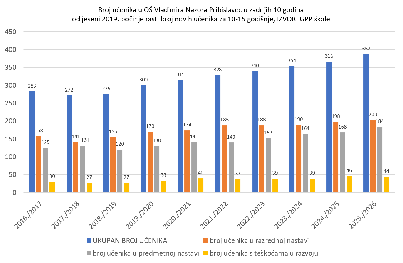 Osnovna škola u Pribislavcu posljednjih osam godina bilježi stalni rast broja učenika – od 272 u 2017./18. do 387 u školskoj godini 2025./26.