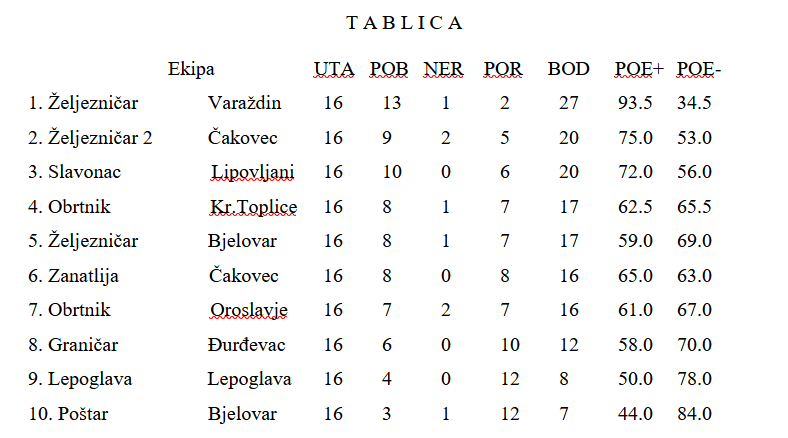 U 16. kolu 2. hrvatske kuglačke lige međusobno su igrala dva međimurska drugoligaša, a formalno domaćin je bio Zanatlija. Nakon u većem dijelu dominantne igre Željezničara 2 na kraju su oni zabilježili samo 5:3 pobjedu, za 45 čunjeva.