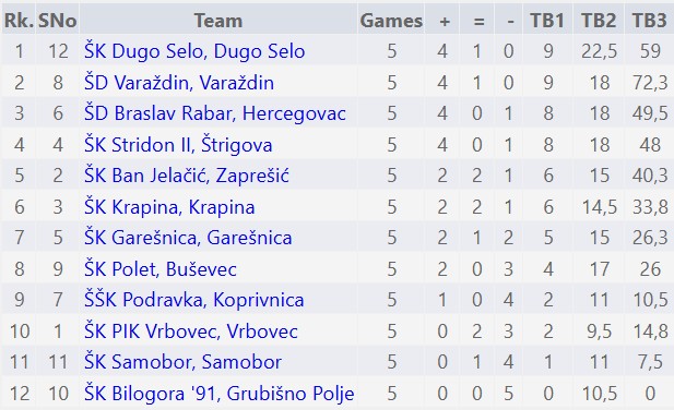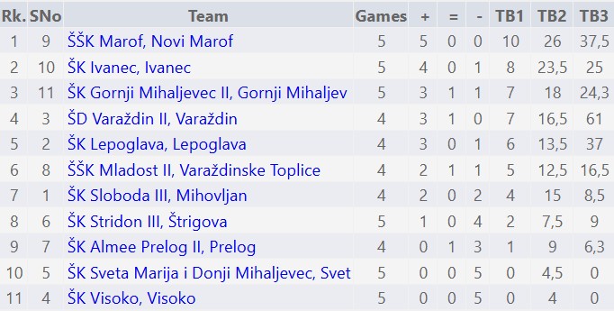 Iza njih slijedi ekipa ŠK Čakovec iz Čakovca s 6 bodova, dok je trećeplasirani ŠK Gornji Mihaljevec s 5 bodova. Nastavak natjecanja prema rasporedu bit će u rujnu ove godine.