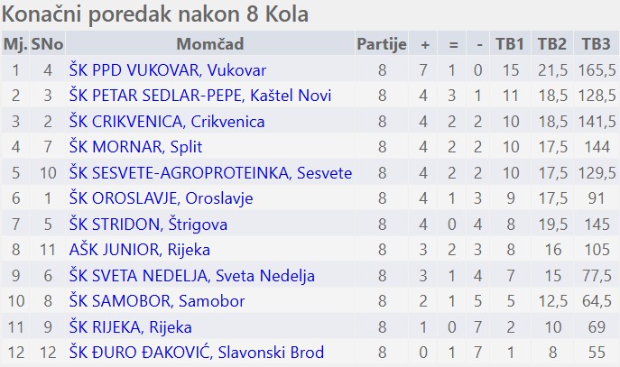 Nažalost, poraz u posljednjem, 8. kolu protiv ekipe ŠK Petar Sedlar-Pepe iz Kaštel Novog značio je pad na konačno 7. mjesto.