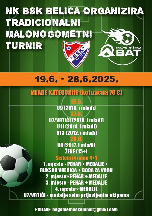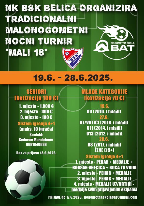 Nogometni klub BSK Belica u suradnji s Nogometnom školom BAT organizira tradicionalni noćni malonogometni turnir “Mali 18“, koji će se održati od 19. do 28. lipnja 2025. godine na nogometnim terenima u Belici.