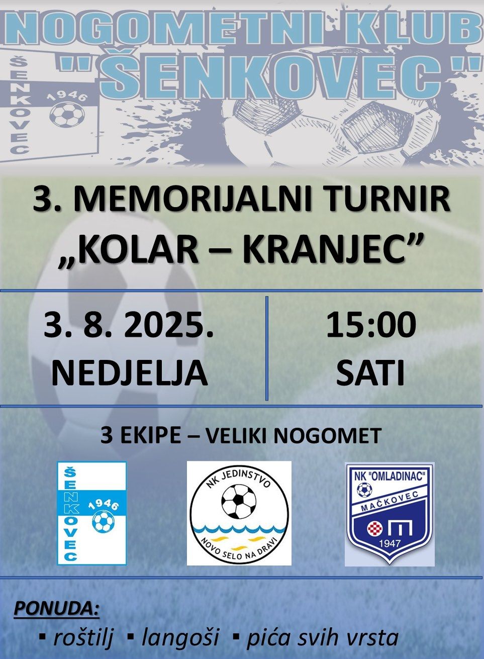 Nogometni klub „Šenkovec“ ove nedjelje, 3. kolovoza 2025., s početkom u 15:00 sati, organizira 3. memorijalni turnir „Kolar – Kranjec“, u znak sjećanja na zaslužne članove kluba i zajednice