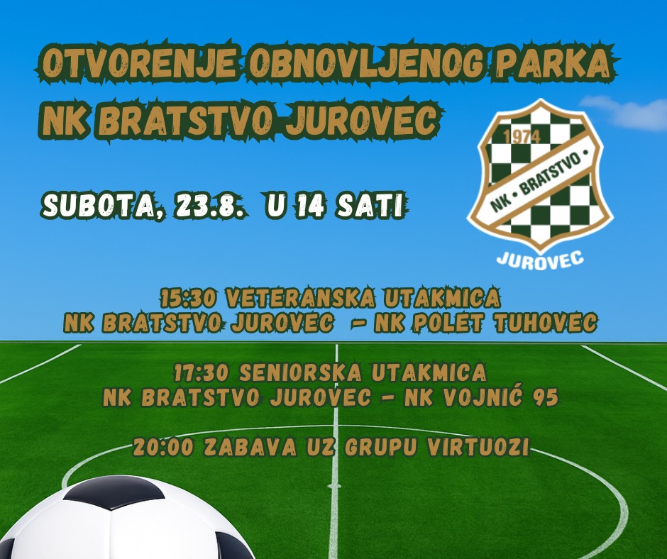 Nogometni klub “Bratstvo” Jurovec s ponosom najavljuje svečano otvorenje obnovljenog parka, koje će se održati u subotu, 23. kolovoza.