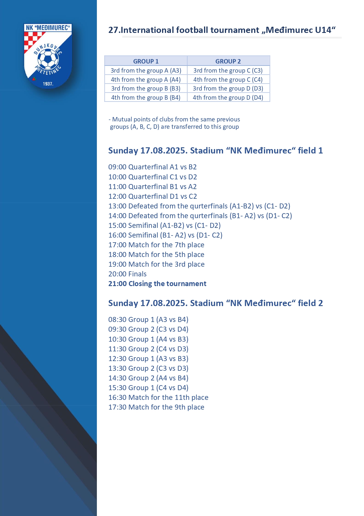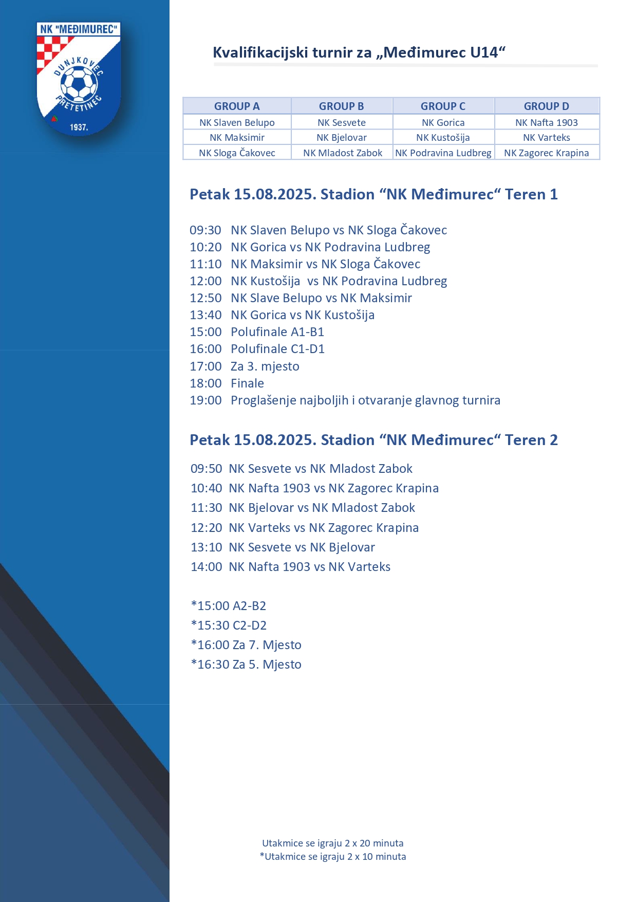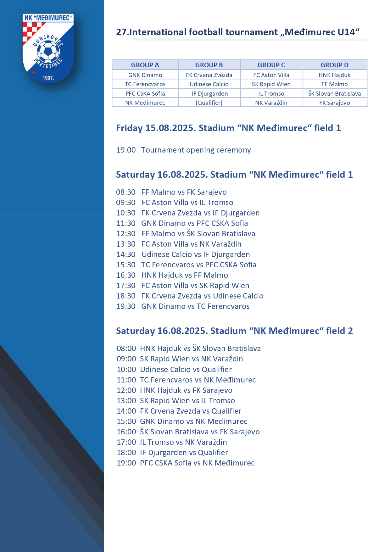 Od 15. do 17. kolovoza Međimurje će biti domaćin 27. izdanja „Međimurec U-14“ turnira s 16 momčadi iz 12 država, uključujući Dinamo, Hajduk, Aston Villu i Udinese.