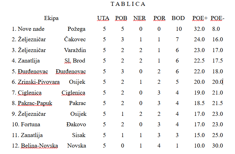 U 5. kolu 1. hrvatske kuglačke lige kuglači Željezničara su gostovali kod prvog favorita lige momčadi Nove nade u Požegi. Ne čudi to što su poraženi, ali ono što bode u oči je 0:8 i samo 3.393 srušena čunja momčadi, nakon što su u prva 4 kola stalno rušili preko 3.500. Da su ponovili takav rezultat ozbiljno bi ugrozili domaćine, a ovako sve je ispalo slabašno.