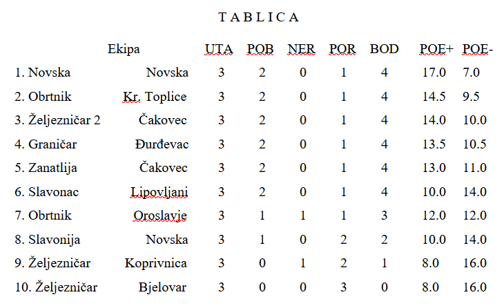 Gosti Željezničara iz Novske pružali su jači otpor nego se očekivalo, a čak dvojica gostiju prešli su brojku 600 što nije često kod gostujućih ekipa u 2. ligi. Prvi je bio u prvom bloku pa iako je većinu nastupa igrao solidno Goran Vrček (561) nije došao do poena.