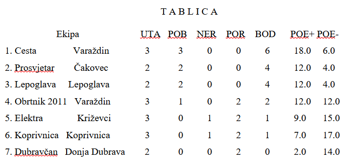 Najbolji pojedinac nastupio je već u prvom bloku, Zvonimir Plevnjak je srušio 560 čunjeva, a uz njega poene su osvojili Stjepan Blažek (552), Ilija Višić i Emil Horvat (542) i Ivan Pigac (527). Niti Josip Šarić (511) ne bi poklonio poen jer je srušio 2 čunja više, ali je protivnik osvojio 3 seta pa je tako utješio goste.