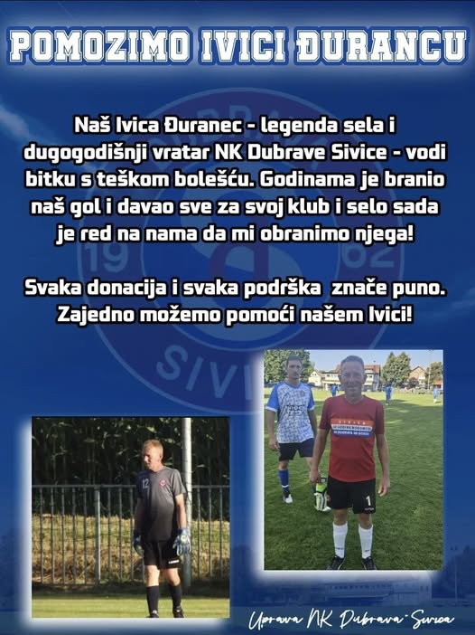 „Naš Ivica Đuranec – legenda sela i dugogodišnji vratar NK Dubrave Sivice – vodi bitku s teškom bolešću. Godinama je branio naš gol i davao sve za svoj klub i selo, sada je red na nama da mi obranimo njega! Svaka donacija i svaka podrška znače puno. Zajedno možemo pomoći našem Ivici!“, poručuju iz Uprave NK Dubrava Sivice.