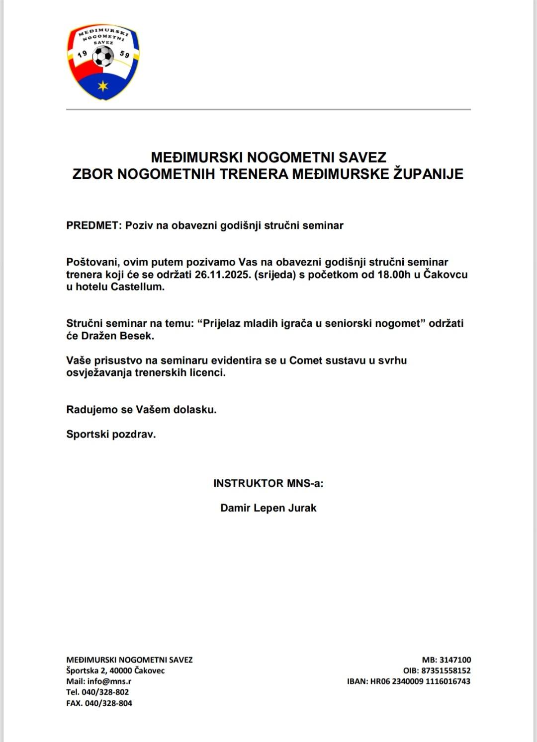 Međimurski nogometni savez i Zbor nogometnih trenera Međimurske županije uputili su službeni poziv svim trenerima na obavezni godišnji stručni seminar, koji će se održati u srijedu, 26. studenoga 2025. godine, s početkom u 18 sati u hotelu Castellum u Čakovcu.