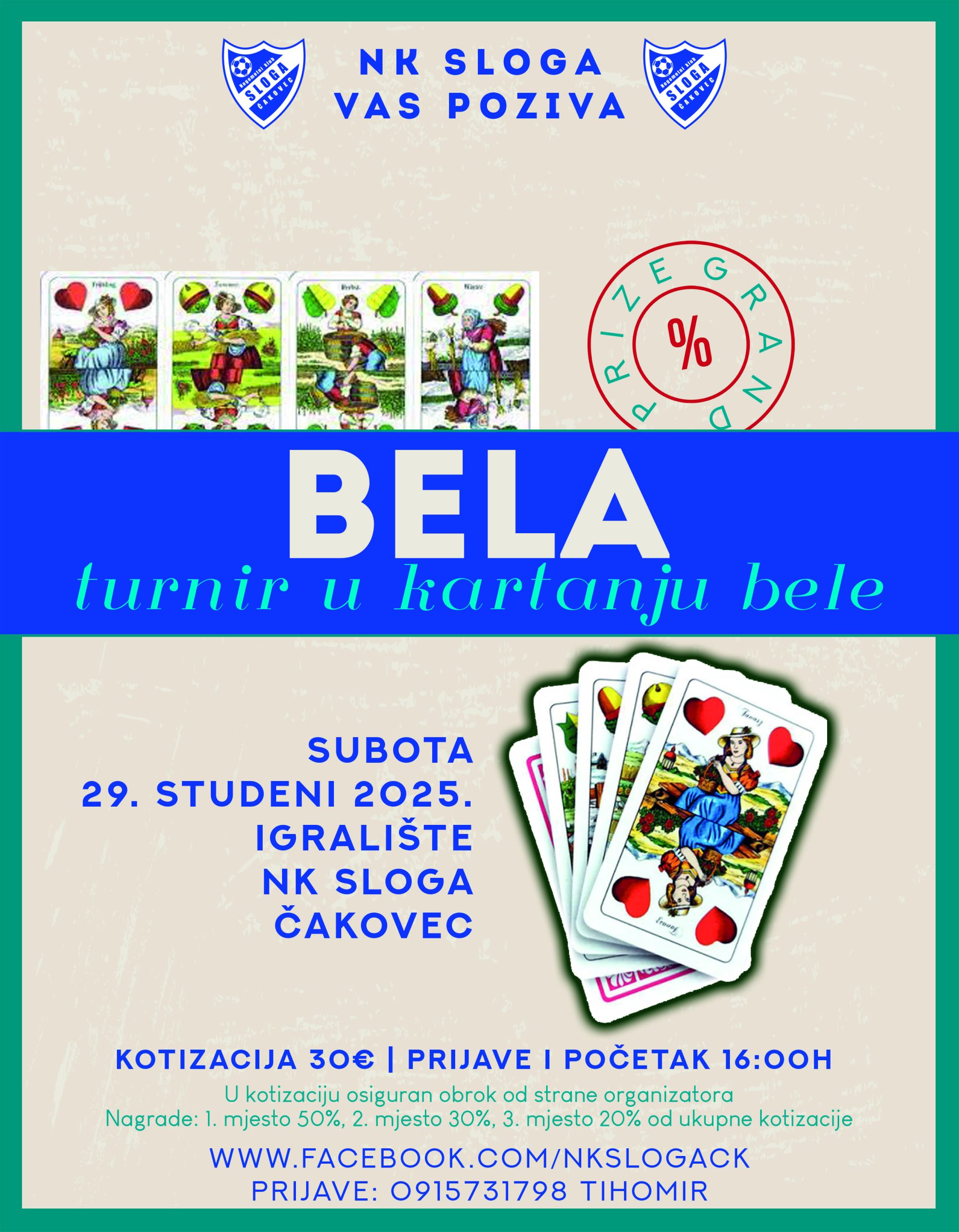 NK Sloga Čakovec s veseljem poziva sve ljubitelje bele na tradicionalni turnir u kartanju koji će se održati u subotu, 29. studenoga 2025. godine, na igralištu kluba u Čakovcu. Početak turnira najavljen je za 16 sati, a kotizacija iznosi 30 eura. Organizator za sve sudionike osigurava i obrok.
