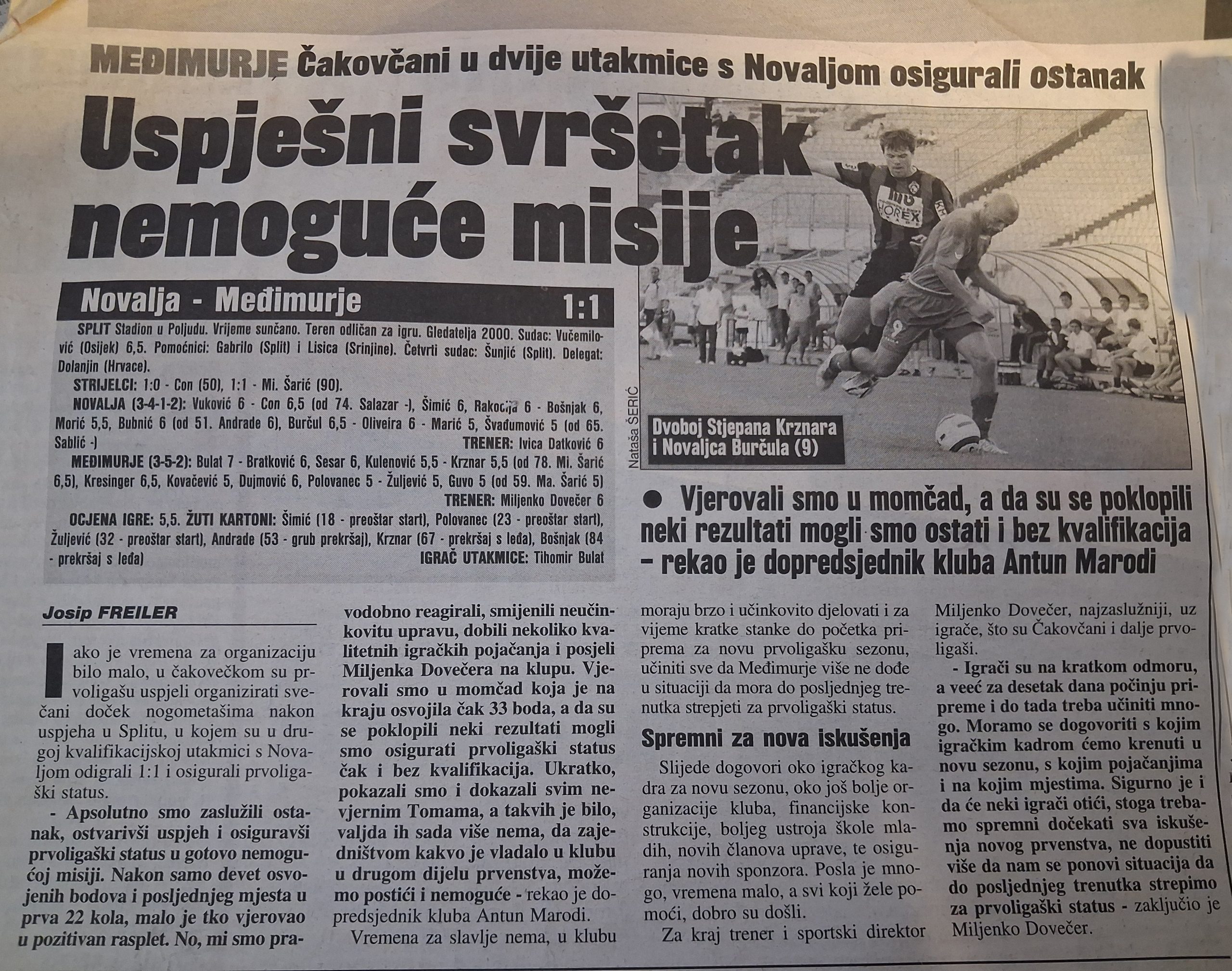 Prije 20 godina nogometaši Međimurja igrali su u 1. HNL gdje su prvenstvo u tadašnjoj Ligi za opstanak završili na 5. mjestu što im je donijelo i kvalifikacije za zadržavanje prvoligaškog statusa.