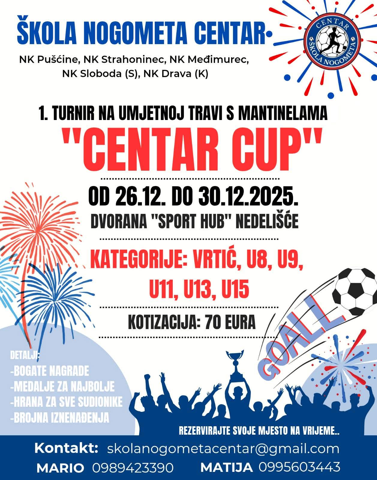 Od 26. do 30. prosinca u dvoraniSport Hub Nedelišće održat će se 1. CENTAR CUP, veliki dječji nogometni turnir u organizaciji Škole nogometa Centar, koju čine klubovi NK Međimurec, NK Pušćine, NK Sloboda Slakovec, NK Strahoninec i NK Drava Kuršanec.
