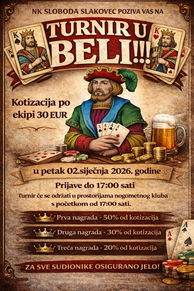 Nogometni klub Sloboda Slakovec i ove godine organizira Turnir u beli, tradicionalno natjecanje koje okuplja ljubitelje kartaških igara i sportskog druženja.