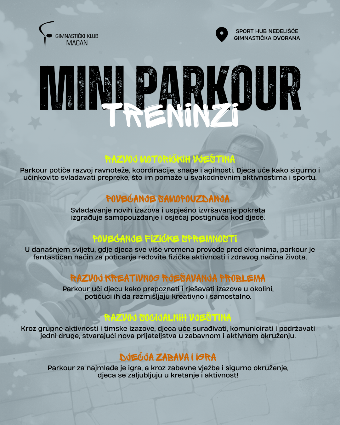 Gimnastički klub Macan, koji se posljednje tri godine posvetio razvoju parkoura u Međimurskoj županiji, najavljuje pokretanje novog, inovativnog sportskog programa pod nazivom Mini Parkour, namijenjenog isključivo djeci vrtićke dobi.