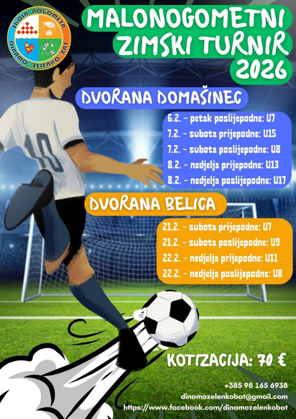 Malonogometni zimski turnir 2026 održat će se u Dvorani Domašinec i Belica uz kotizaciju od 70 € po ekipi i natjecanja za različite dobne kategorije