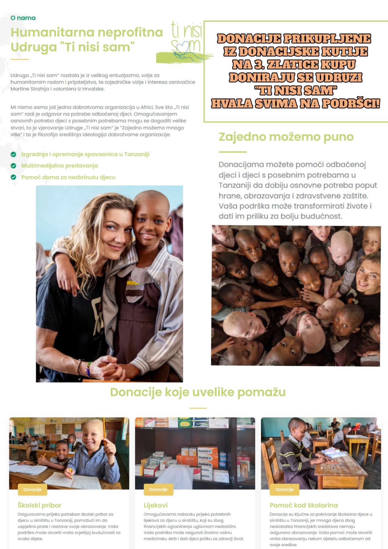 Ove subote od 13h ŽNK Zlatice organizira malonogometni spektakl i prikupljanje donacija za udrugu “TI NISI SAM”, novci će preko fotografkinje Martine Strahije stići do djece u Africi