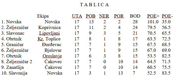 Slično je i sa Zanatlijom, s time da su oni imali za protivnika prvaka lige i budućeg prvoligaša Novsku pa ne čudi visoki poraz. Susret je riješen u prva dva bloka u kojima su gosti osvojili sva četiri poena, a uz to i napravili veliki plus u čunjevima.