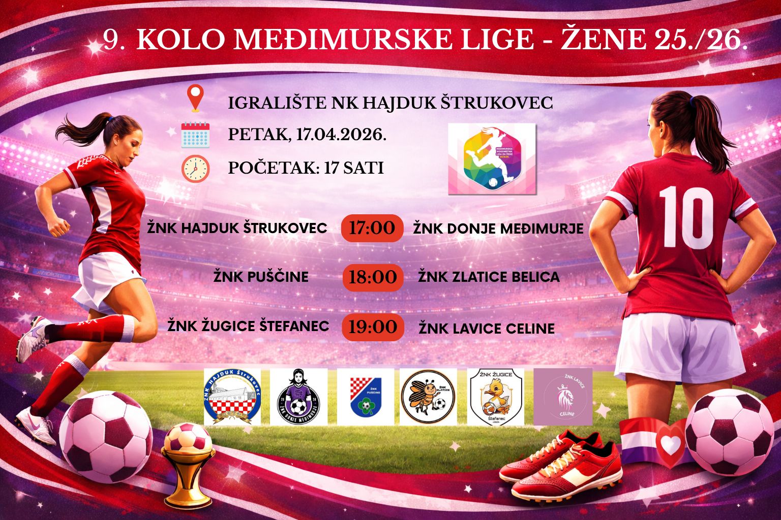 Deveto kolo Međimurske lige za žene u sezoni 2025./2026. donosi novi nogometni dan ispunjen natjecateljskim ritmom. Sve utakmice igrat će se u petak, 17. travnja 2026. godine, na igralištu NK Hajduk Štrukovec u Štrukovcu.