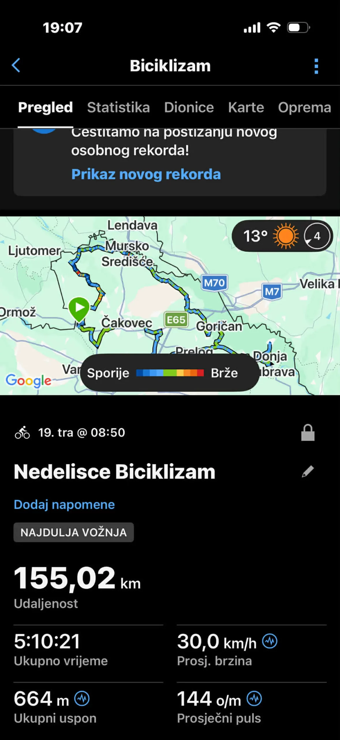 I uspio je! Danas nam je javio rezultat – 155,02 kilometara prošao je u 5 sati, 10 minuta i 21 sekundu, uz prosječnu brzinu od 30 kilometara na sat.